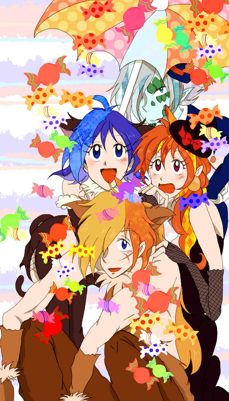 陽子氏からいただいた、「お菓子一杯でウハウハな4人」です。